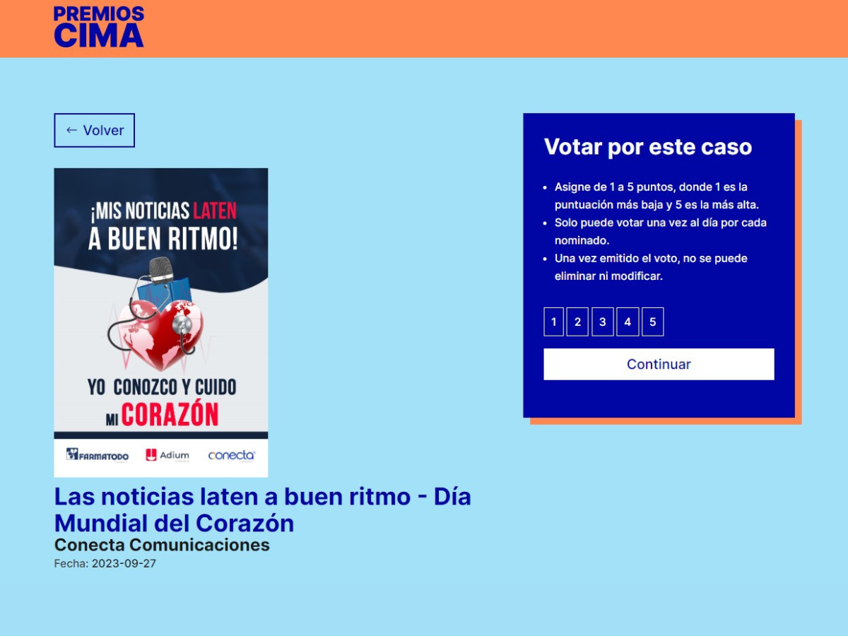 La agencia de comunicaciones estratégicas Conecta Comunicaciones está entre los nominados de los Premios CIMA 2024 en la categoría de «Relaciones Públicas» con el proyecto «Las noticias laten a buen ritmo-Día Mundial del Corazón», que llevó adelante en 2023 a propósito del Día Mundial del Corazón.